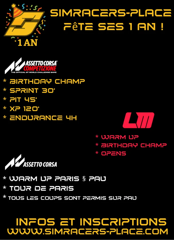 Rejoins nous sur discord ou Facebook, N’hésite pas à nous contacter, des courses, championnats propres et fairplay pour tous les niveaux ! Licence requise uniquement pour Championnats et GT3 HOUR * Spécifié en Page d’event quand nécessaire